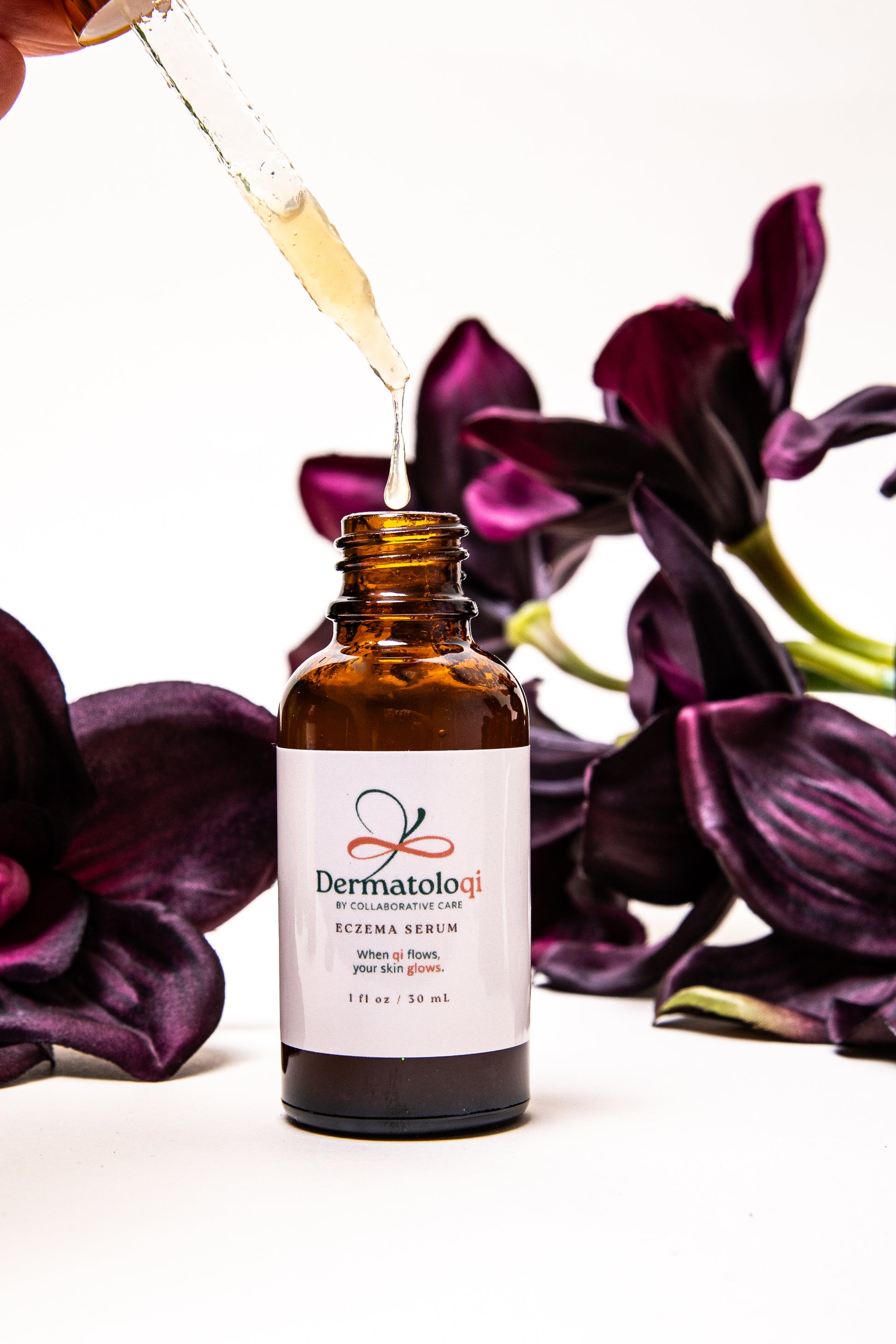Eczema varies for everyone and managing it long-term with pharmaceuticals has potential side effects, often making them unappealing. Over-the-counter and pharmaceutical topicals are laden with chemicals to extend shelf life, maximize absorption, enhance texture and smell, and isolate key ingredients. These chemicals dominate the makeup of such products, and while sometimes effective, they disrupt our endocrine systems and aren't ideal for long-term use, with symptoms often returning when discontinued. At Dermatoloqi, we focus on holistic skincare - combining skin treatment with dietary changes, lifestyle modifications and stress reduction - to manage eczema. Our eczema serum naturally soothes itchiness and dryness, healing without harmful chemicals.